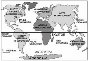 Yeryüzünün yüzölçümü 510 milyon km kare’dir. Bunun yaklaşık 149 milyon km kare’si (% 29’u) karalarla kaplıdır. 361 milyon km kare’si (%71’i) okyanuslarla kaplıdır.