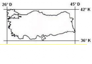 Türkiye’nin Matematik Konumu: 36°-42°kuzey enlemleri, 26°-45° doğu boylamları arasında yer alır